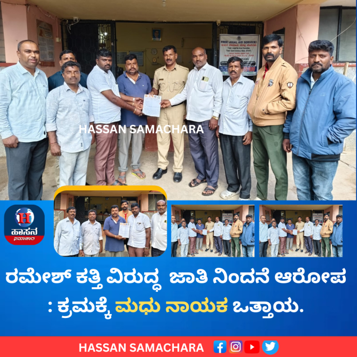 ದಲಿತ ಸಮಾಜಕ್ಕೆ ಜಾತಿ ನಿಂದನೆ ಮಾಡಿದ ಮಾಜಿ ಸಂಸದ ರಮೇಶ್ ಕತ್ತಿ ವಿರುದ್ಧ ಜಾತಿ ನಿಂದನೆ ಪ್ರಕರಣ ದಾಖಲಿಸಿ ಕಾನೂನು ಕ್ರಮ ಕೈಗೊಳ್ಳಬೇಕೆಂದು ಬೇಲೂರು ತಾಲೂಕು ಶ್ರೀ ಮಹರ್ಷಿ ವಾಲ್ಮೀಕಿ ಸಂಘದ ವತಿಯಿಂದ ಬೇಲೂರು ಆರಕ್ಷಕ ಠಾಣೆಗೆ ಮನವಿ ಸಲ್ಲಿಸಲಾಯಿತು.